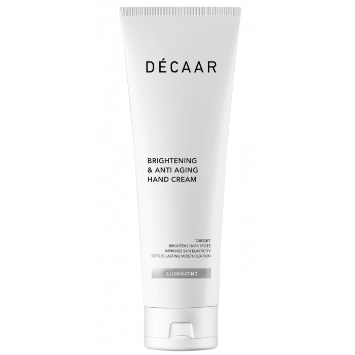 Onze nieuwste toevoeging aan de DÉCAAR-productfamilie is een lichtgewicht, snel absorberende crème die helpt om de huid te verhelderen en egaler te maken. Pigmentvlekken worden zichtbaar verminderd. De huid wordt intensief gehydrateerd en verzorgd. Door de speciale technologie, wordt er een beschermende laag gelegd waardoor de handen heerlijk zacht worden en minder snel uitdrogen. Een primeur in zijn soort met zowel anti-aging als verhelderende eigenschappen.